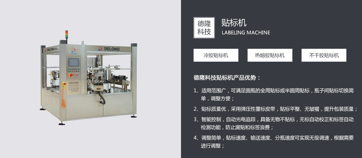 青島德隆自1995年創建以來,始終秉承創新與發展的優良傳統,依靠技術與服務贏得客戶的信賴與尊重。在貼標機向專注化、多行業領域發展并成就了中國異型瓶貼標市場的經典之后,應市場不斷變化的客戶需求,優化產品結構,引進吸收國內外的流體包裝設備理念,在貼標機專業化地位穩固的前提下,逐步實現關聯產品的多元化。   目前,青島德隆已經成為國內能同時滿足圓瓶、方瓶、扁瓶、錐度瓶、球形瓶、定位瓶等瓶型的高、中、低速多功能冷(熱)膠貼標領域的廠家。隨著碼/卸(瓶/罐)垛機、沖瓶機、灌裝擠(旋/壓)蓋機、全自動紙箱包箱設備、排序機、機器人碼/卸垛設備、激光噴碼機的運行成功,一個真正的流體包裝設備方案解決專家已經成熟。   青島德隆集團的···......[查看詳情]
